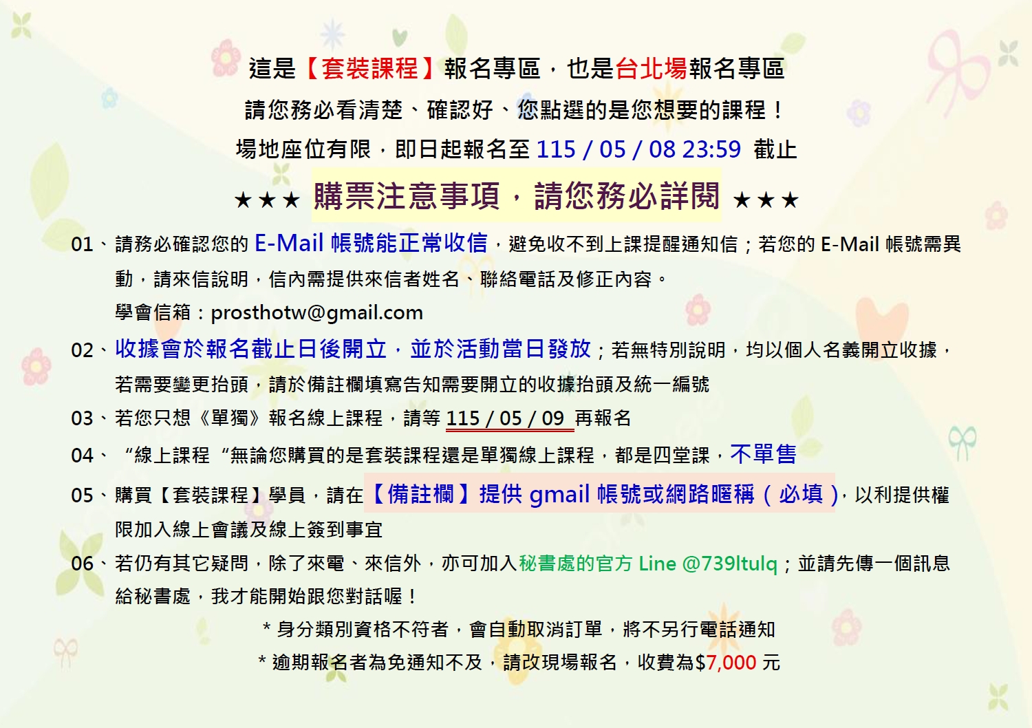另~購買【套裝課程】學員,在【備註欄】必填gmail帳號或網路暱稱,以利提供權限加入線上會議及線上簽到事宜